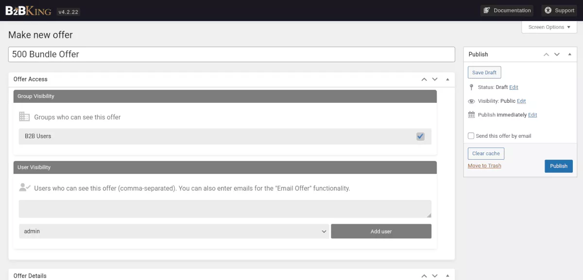 Teklifler, belirli müşteriler veya gruplar için özel bir şey oluşturmanıza olanak tanıyan bir özelliktir. Örneğin, bir müşterinin 500 ürün satın aldığı ve indirimli fiyat aldığı bir paket teklifi yapabilirsiniz. İlk olarak, Diğer ve Gelişmiş Ayarlar altında özelliği etkinleştirirsiniz. Ardından, oluşturmak için B2BKing > Teklifler'e gidin. Grup Görünürlüğü, Kullanıcı Görünürlüğü, Teklif Ayrıntıları ve Özel Metin Teklifi gibi şeyleri ayarlayabilirsiniz.