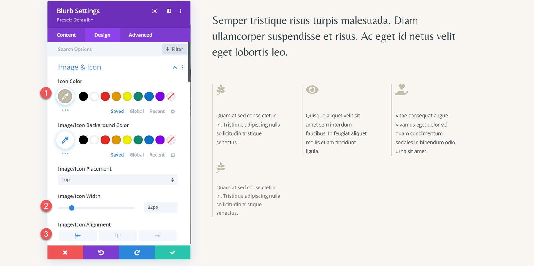 بعد ذلك، انتقل إلى علامة التبويب "التصميم" وافتح إعدادات الصورة والأيقونات. قم بتعيين لون الرمز وعرض الصورة/الرمز ومحاذاة الصورة/الرمز.