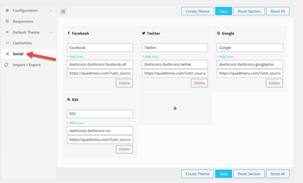 بعد ذلك ، سترى قسم التواصل الاجتماعي ضمن خيارات القائمة الرئيسية. مرر مؤشر الماوس فوقها وسترى خيارات تخصيص QuadMenu.