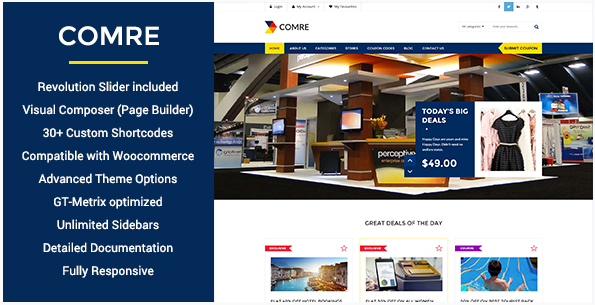 Comre هو موضوع WordPress لإنشاء موقع ويب للقسائم وأكواد الإعلان. يأتي مع متجر لتقديم كوبونات عالية السعر للتسوق عبر الإنترنت. تم إنشاء المتجر باستخدام Woocommerce ، البرنامج المساعد الشهير والمرن في التجارة الإلكترونية.