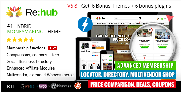 REHub هو موضوع هجين متعدد الأغراض في العصر الحديث. يغطي الموضوع العديد من نماذج الأعمال الحالية لمواقع جديرة بالاهتمام. يمكن تكوين كل عنصر واستخدامه بشكل منفصل أو يمكنك دمجها في موقع متعدد الوظائف.