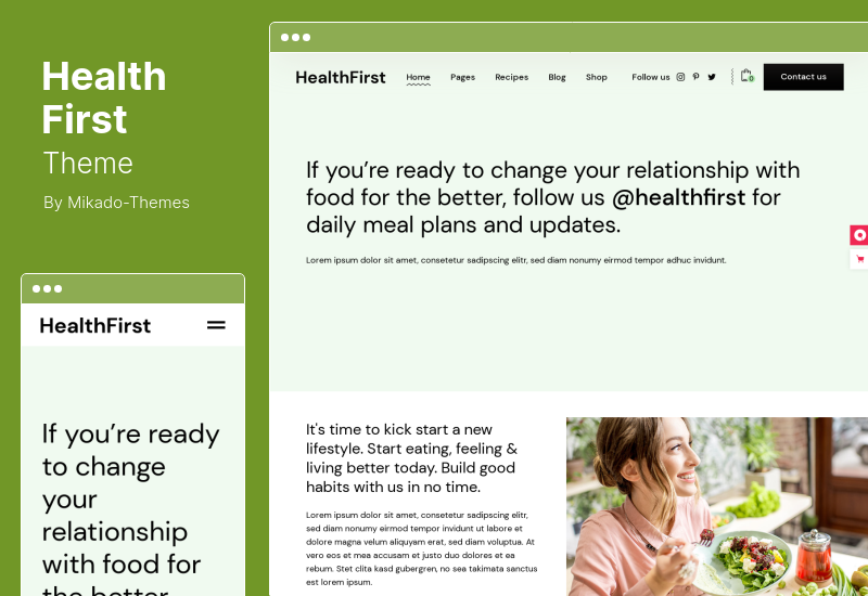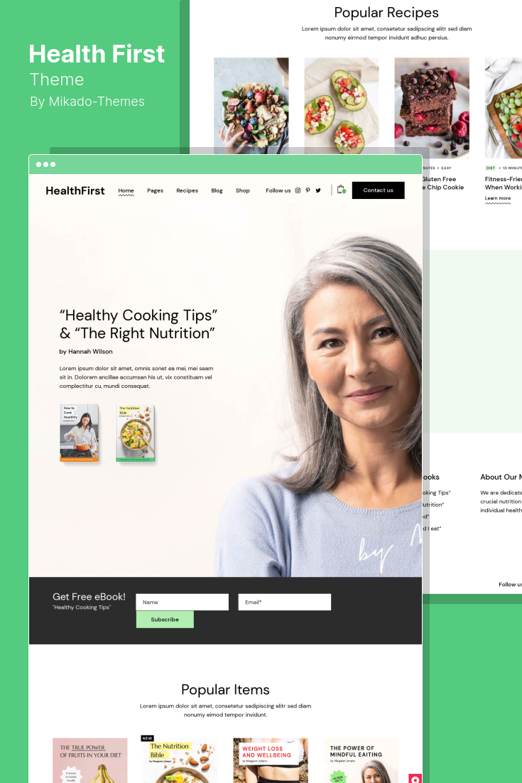 HealthFirst هي سمة WordPress للتغذية والوصفات يمكن تطبيقها على اختصاصيي التغذية وطهي الطعام الصحي والبودكاست والمدونات والمواقع الإلكترونية.