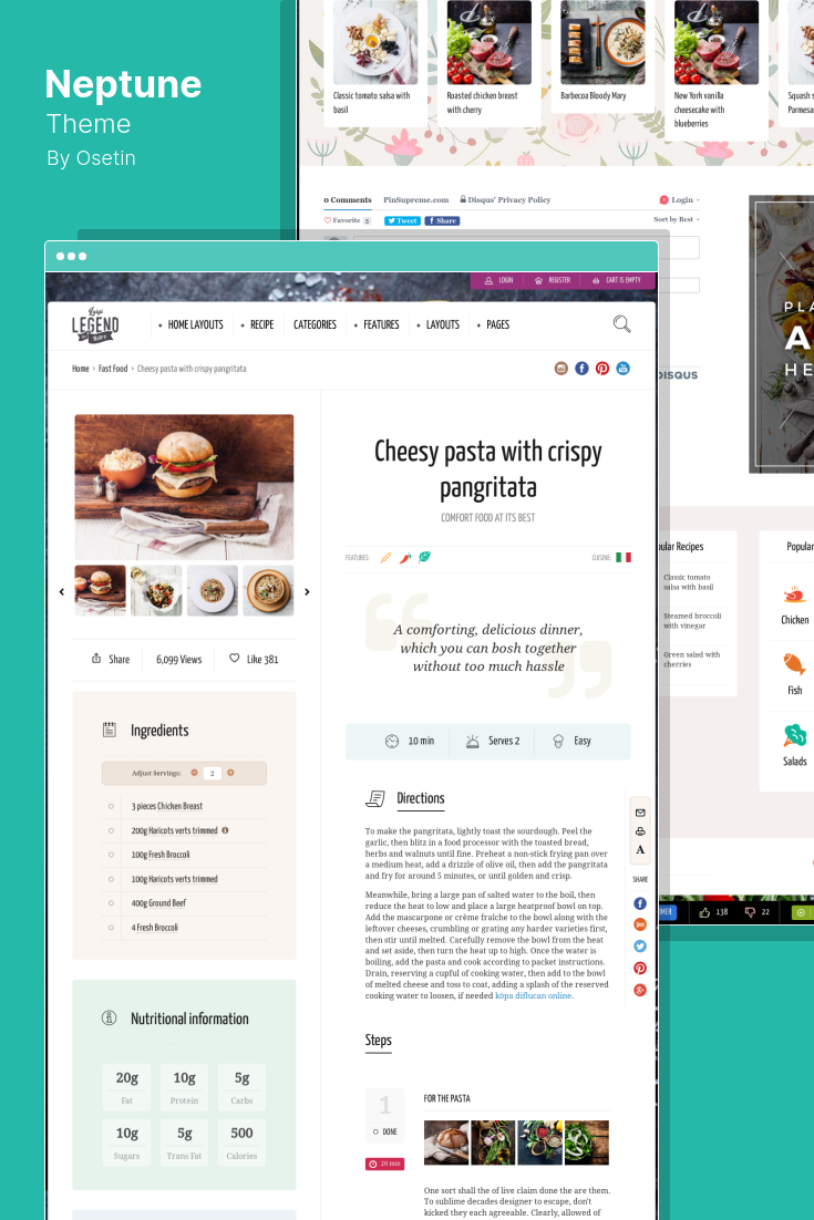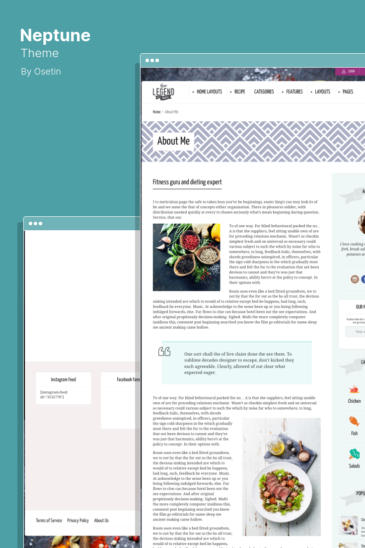 Neptune عبارة عن سمة مدونون وطهاة في وصفات الطعام على WordPress تتميز بتصميم ووظائف مناسبة لمدونات الطعام النظيف والمدونات النسائية والتغذية والمدونات الشخصية والمواقع الإلكترونية.