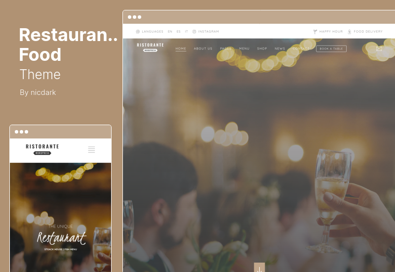 يشتمل هذا الموضوع أيضًا على المكون الإضافي WPBakery لـ WordPress والمكوِّن الإضافي Slider Revolution Responsive WordPress. يمكن أيضًا نشر قوائم المطاعم كأنواع منشورات مخصصة.