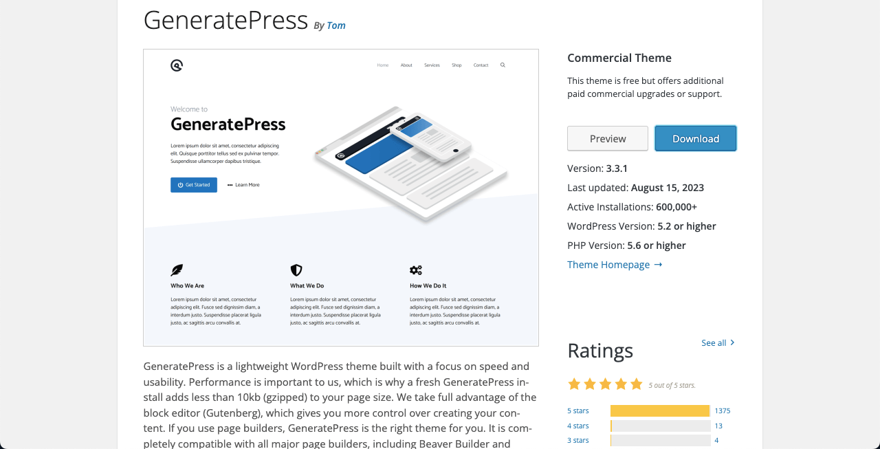 مع أكثر من 600,000 عملية تثبيت نشطة، تعد GeneratePress سمة WordPress رائعة وشائعة ومتعددة الأغراض ومتوافقة مع WooCommerce. لقد جعلت المجموعة الواسعة من الميزات وخيارات التخصيص الموضوع يبرز كخيار ممتاز لإنشاء مواقع التجارة الإلكترونية.