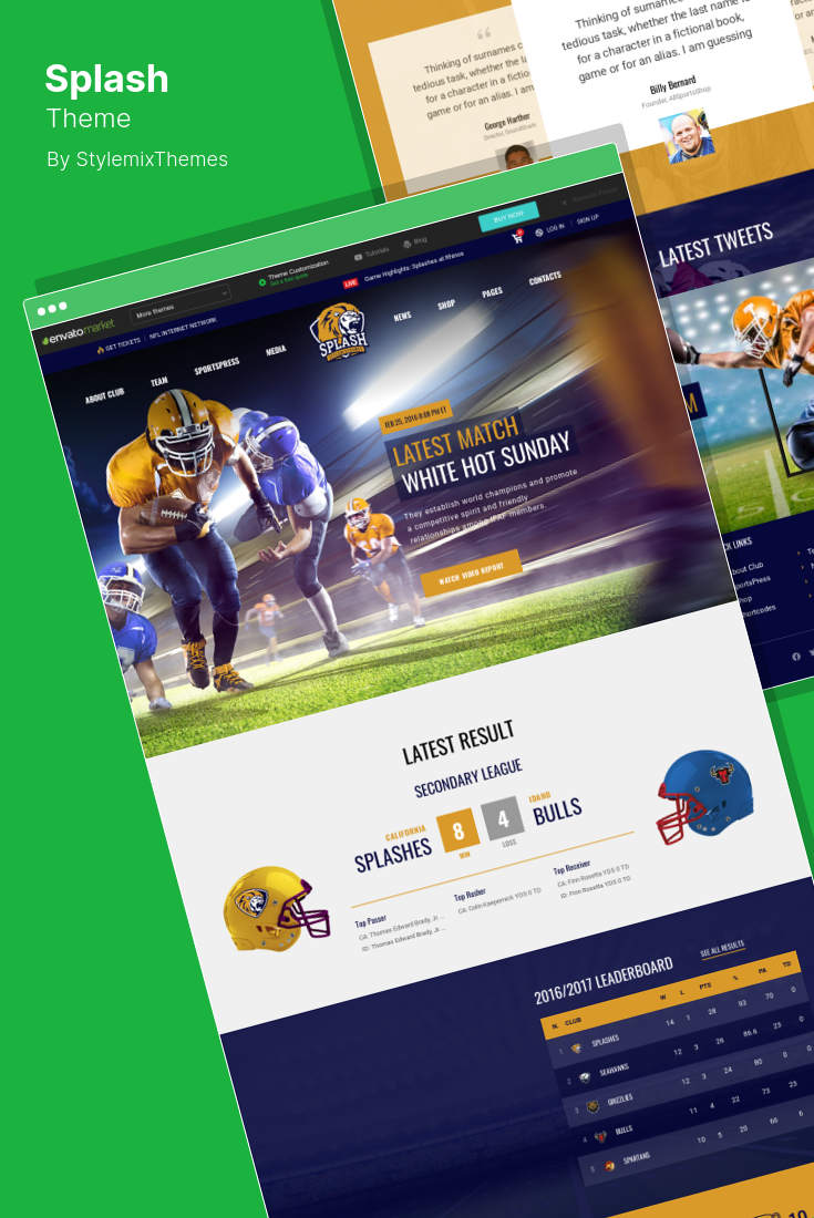 Splash هو موضوع ووردبريس رياضي مصمم للهوكي وكرة السلة وكرة القدم والأخبار الرياضية والمواقع الإلكترونية.