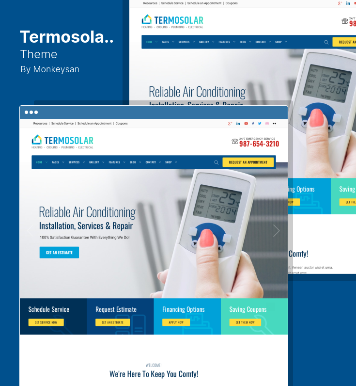 موضوع Termosolar WordPress يعمل بكامل طاقته ويتميز بتصميم جذاب مصمم خصيصًا للشركات التي توفر خدمات التدفئة والتهوية والسباكة والتركيب الكهربائي والصيانة.