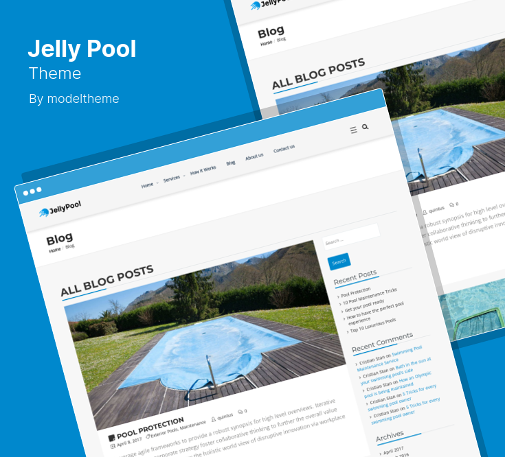 يعد موضوع JellyPool WordPress هو الخيار الأمثل إذا كنت تبحث عن سمة توفر صيانة وتنظيفًا مباشرًا لحمام السباحة الخاص بك.