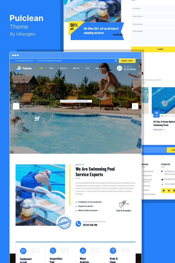 مع Pulclean ، يمكنك إنشاء موقع ويب أنيق وعصري مثالي لصيانة المسابح وتنظيفها وشركات خدمات الإصلاح.