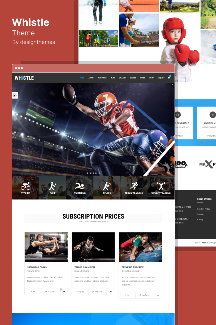 يوفر موضوع Whistle جميع الميزات التي قد تحتاجها لموقع الويب الخاص بالصالة الرياضية ، بما في ذلك جداول الحصص ومدربي اللياقة البدنية والمعارض الرياضية ومدونات اللياقة البدنية وصفحات الاتصال بالصالة الرياضية.