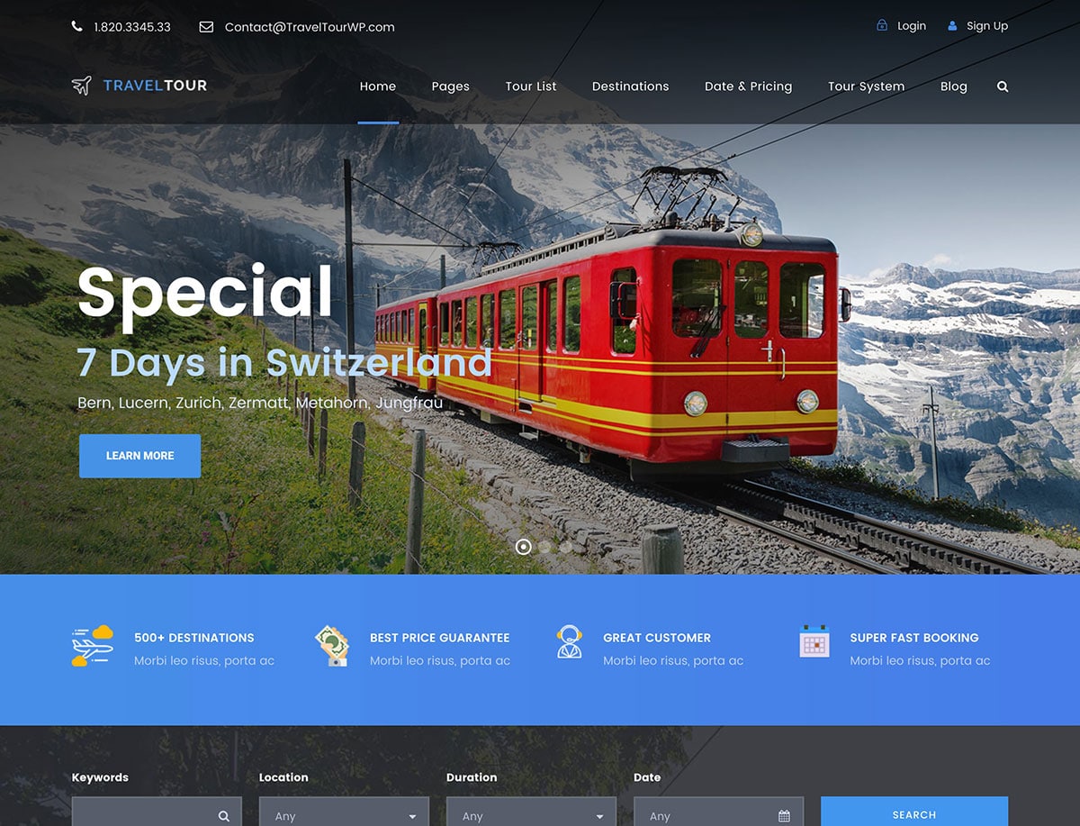 بشكل عام ، تعد Travel Tour موضوعًا مركزًا يوفر لك الأدوات التي تحتاجها لتصميم وتشغيل موقع حجز سريع الاستجابة بأقل جهد مع ضمان تجربة عميل مبسطة.