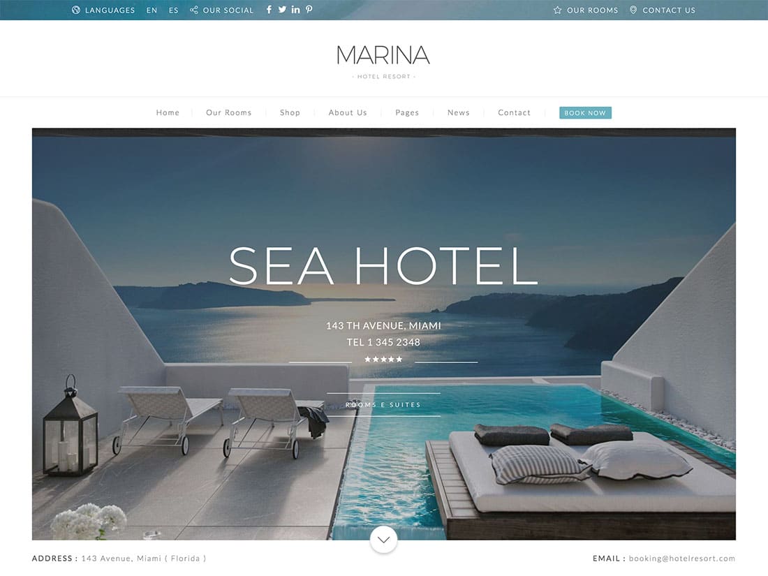 النمط الافتراضي على مستوى الموقع هو الأبيض والأزرق النظيفان وهو مثالي إذا كنت ترغب في إبراز خصائص الواجهة البحرية. يتضمن تخطيطات للفنادق والمنتجعات وحتى الغرف الفردية. مع كل نمط ، يمكنك تضمين الأسعار مباشرة داخل كل صورة تعرضها للزائرين ، حتى يعرفوا دائمًا ما يحصلون عليه مقابل أموالهم.