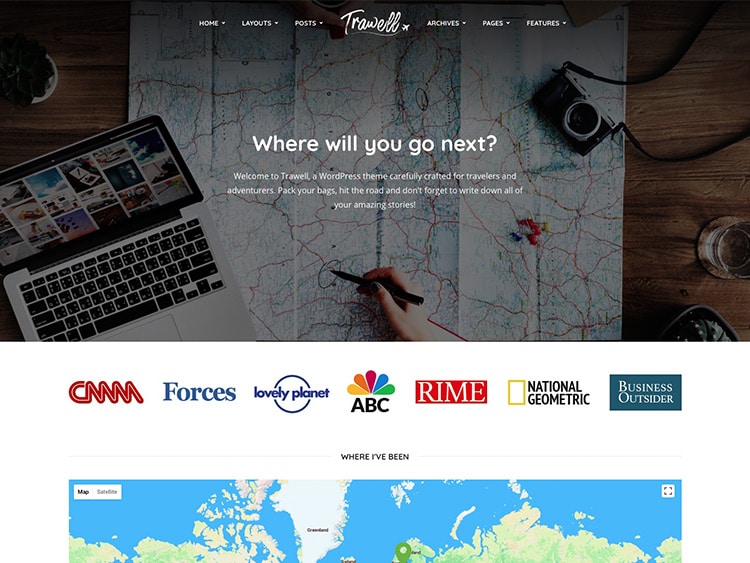 يقدم المظهر أربعة أشكال مختلفة للصفحة الرئيسية: شريط تمرير أو خريطة أو فيديو أو مدونة قياسية. تتيح لك الصفحة الرئيسية أيضًا عرض شعارات منشورات السفر التي ساهمت فيها أو التي تم تمييزك فيها. علاوة على ذلك ، يمكنك عرض خريطة لجميع الأماكن التي زرتها.