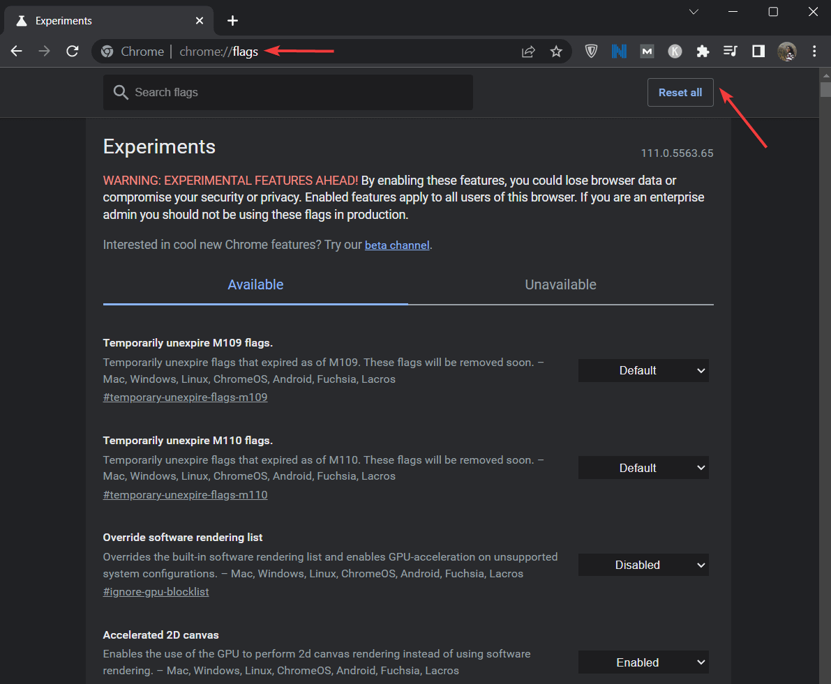 أدخل " chrome: // flags " في شريط عنوان المتصفح واضغط على Enter . ثم حدد زر إعادة تعيين الكل في الجزء العلوي من الشاشة.