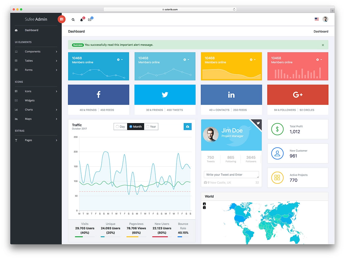 الأناقة والنظافة هما ما تحصل عليه مع نموذج الإدارة المجاني ، Klorofil. بالطبع ، هناك طريقة أكثر من مجرد المظهر ولكننا نحتاج إلى البدء من مكان ما ، أليس كذلك؟ مع الخيار المجاني ، تتلقى جميع العناصر الأساسية التي تحتاجها لوحة الإدارة الوظيفية. وهذا يعني ، الجداول والمخططات والجدول الزمني والإشعارات والصفحات المختلفة المحددة مسبقًا. As far as the UI elements go, you are treated with badges, buttons and progress bars. You definitely will not find anything missing.