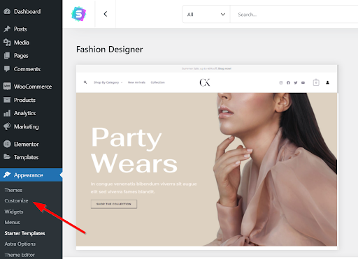 لإعداد واستخدام قوالب التصميم الجاهزة ، انتقل إلى خيارات Astra ضمن علامة التبويب المظهر .