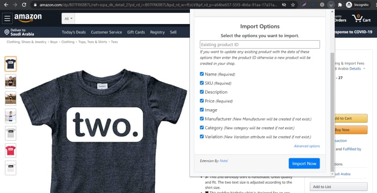 باستخدام هذا المكون الإضافي ، يمكنك استيراد جميع المنتجات بالتفاصيل المطلوبة من أي موقع ويب أمازون. قد يتضمن الاسم والوصف والفئات والشركة المصنعة والصورة والسعر والاختلافات والسمات ومراجعات العملاء وما إلى ذلك. بمجرد الانتهاء من ذلك ، قم ببيع المنتج المستورد على أنه منتجك أو بصفتك شركة تابعة.