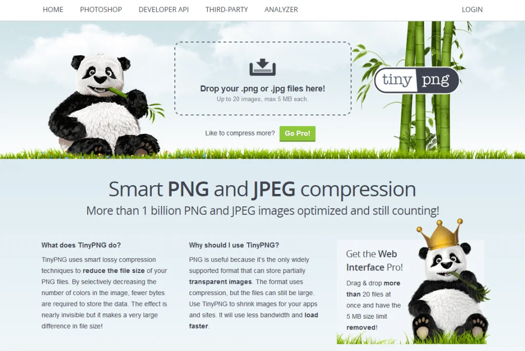 إذا كنت محبطًا من التحميل البطيء لموقعك على الويب ، فاستخدم TinyPNG قبل تحميل الصور إلى موقع الويب الخاص بك واختبر الفرق الهائل. سيوفر لك النطاق الترددي ويجعل تحميل موقعك أسرع عن طريق ضغط جميع صور JPEG و PNG.