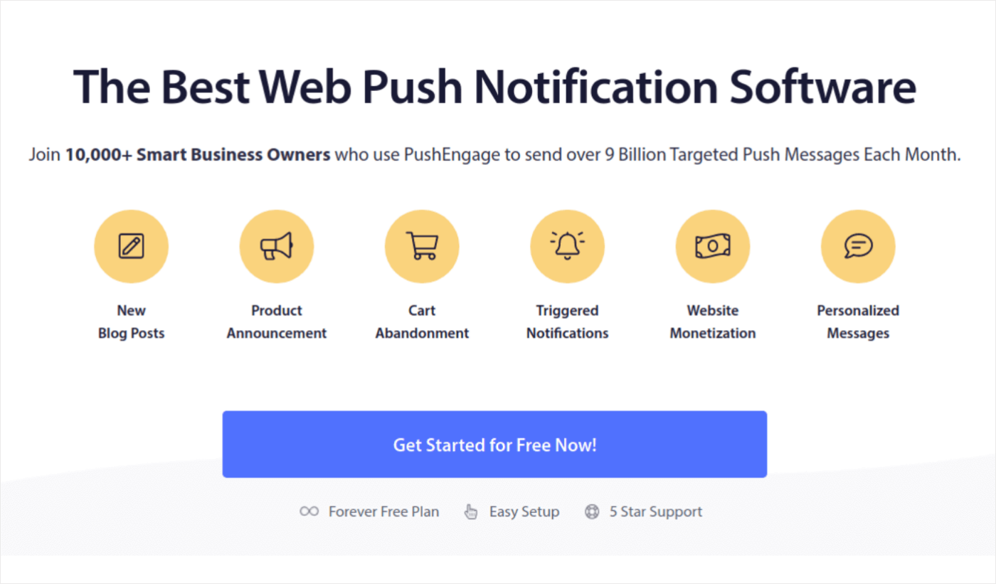 ونعم ، لدى PushEngage خطة مجانية مع ميزات محدودة. تتيح لك الطريقة التي يتم بها سعر PushEngage البدء مجانًا ، والحصول على بعض الانتصارات السريعة باستخدام حملات إشعار الدفع الأساسية ، ثم استخدام أرباحك لترقية وإلغاء تأمين الحملات الأكثر قوة ووظائف الأتمتة.