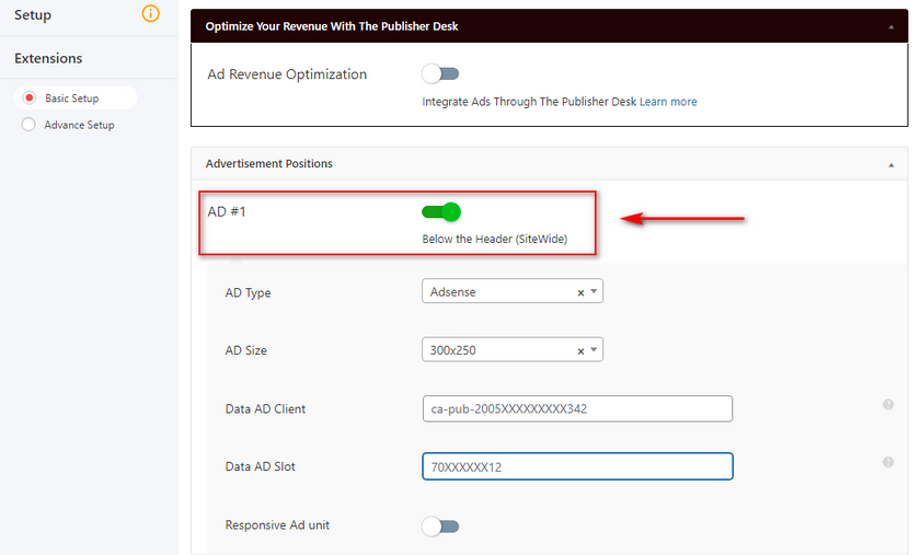 الآن ، ارجع إلى إعدادات المكون الإضافي وأدخل التفاصيل المحفوظة مسبقًا في الحقول الخاصة بها. يمكنك أيضًا تمكين الوحدة الإعلانية المتجاوبة وتبديل حجم الإعلان وفقًا لإعدادات وحدتك الإعلانية.