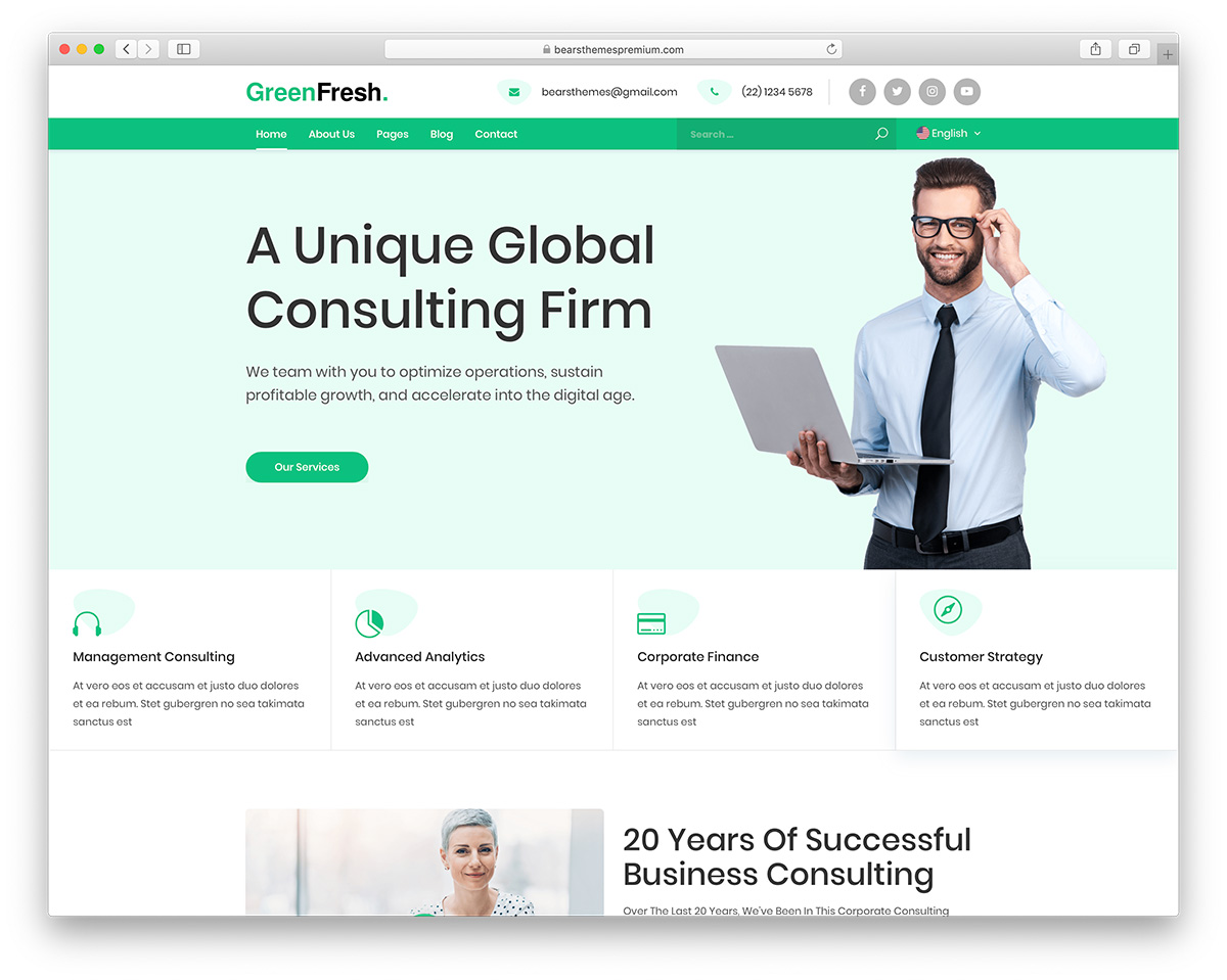 بصفتك شركة محلية ، فأنت بالتأكيد بحاجة إلى التميز من بين الجماهير. سواء كنت في مكانة تنافسية أم لا ، يمكنك القيام بالكثير فيما يتعلق بتمييز نفسك عن الآخرين من خلال موضوع WordPress للأعمال المحلية القاتلة ، GreenFresh. أنت تبحث عن أداة مرنة للغاية وقابلة للتكيف وقابلة للتمديد ولن تواجه مشكلة في تغييرها وفقًا لاحتياجاتك ولوائحك. اجعلها تتبع علامتك التجارية إلى T أو استخدمها خارج الصندوق ، وكلاهما يضمن لك تحفة حقيقية لتصميم الويب.