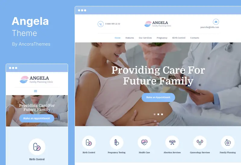 أنجيلا هي سمة WordPress لعيادة تنظيم الأسرة أنيقة ونظيفة مصممة لمراكز الخصوبة ومراكز الحمل وعيادات تنظيم الأسرة.