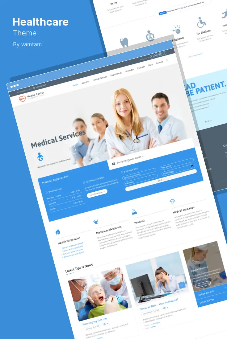 الرعاية الصحية هي موضوع WordPress مصمم خصيصًا للممارسات الطبية والمستشفيات والعيادات والممارسات الأخرى المتعلقة بالرعاية الصحية.
