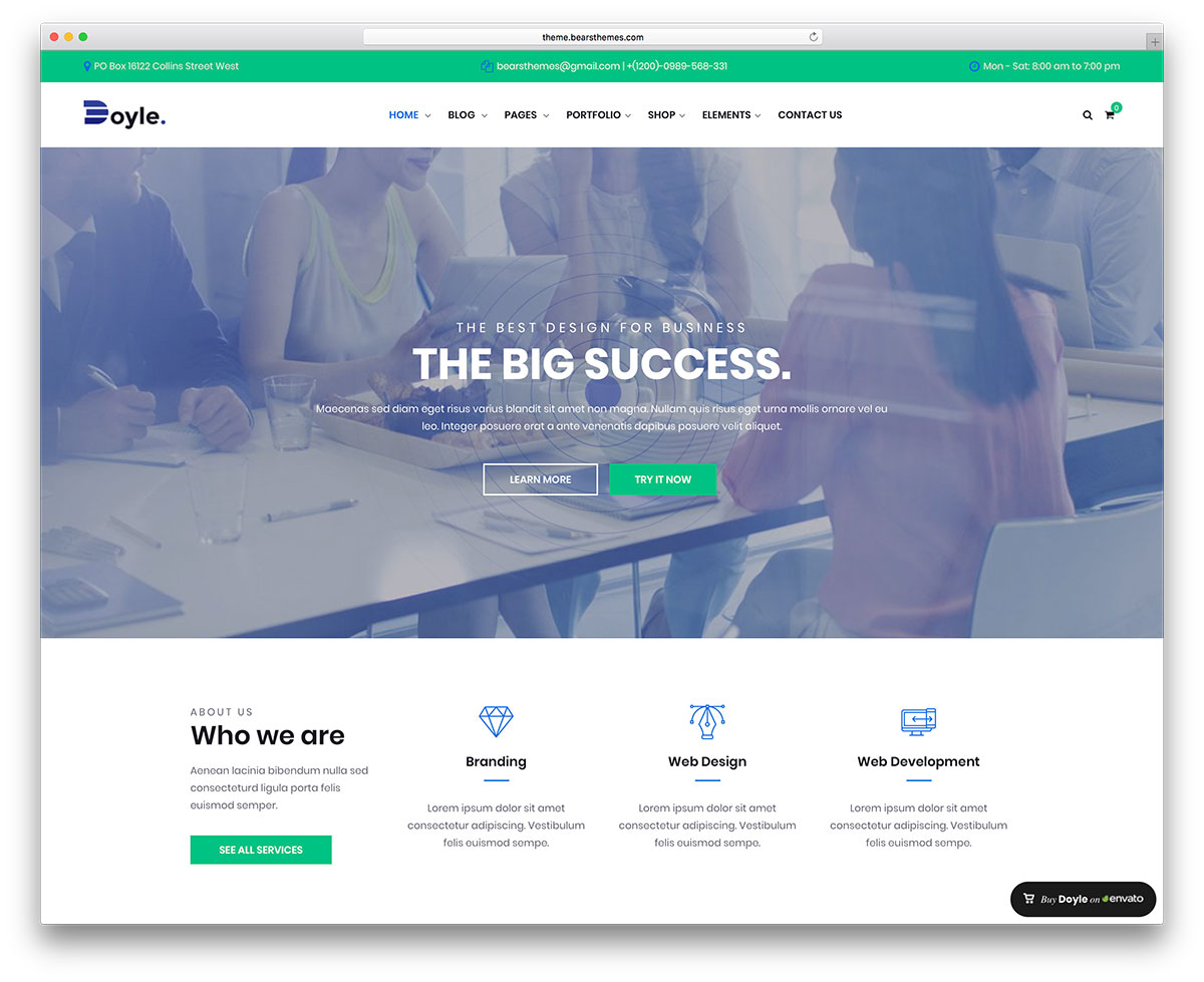دويل هو موضوع يقدم تصميمًا بسيطًا وسريعًا لتحقيق جميع الأغراض المهنية. لديه تحسين سرعة التحميل مما يجعله تخطيطًا سريعًا وسريع الاستجابة. هذا يجعلها متوافقة مع الأجهزة والمتصفحات. ولكنه أيضًا يسهل عليك الوصول إلى الاهتمامات / العملاء المحتملين. تم تصميم Doyle ليكون سهل الاستخدام وبديهيًا للتعرف على خيارات التخصيص الخاصة به. إنه يتميز بمُنشئ صفحات السحب والإفلات WPBakery Page Builder ويتميز بإطار عمل Bootstrap. تتوفر أيضًا تحديثات منتظمة ودعم العملاء على مدار الساعة طوال أيام الأسبوع! جربها الآن! جرب دويل!