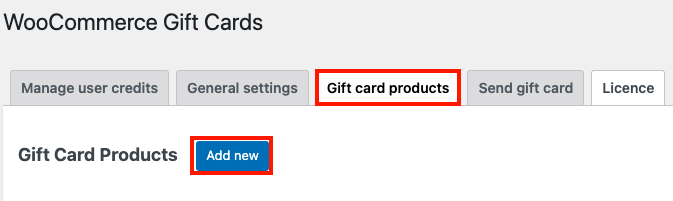 الآن ، انتقل إلى علامة التبويب منتجات بطاقة الهدايا وانقر فوق إضافة جديد .