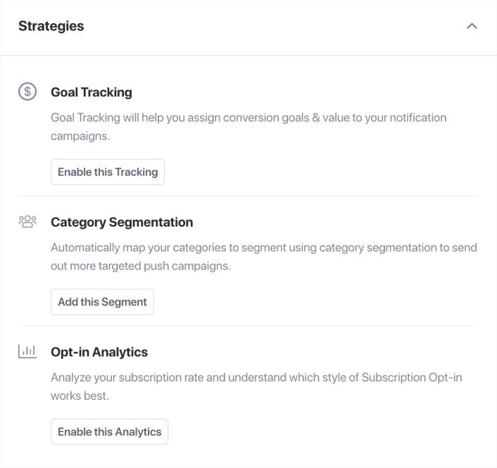 Und wenn Sie weiter nach unten scrollen, sehen Sie empfohlene Strategien, die Ihnen helfen können, schnell mehr Abonnenten von Push-Benachrichtigungen zu gewinnen: