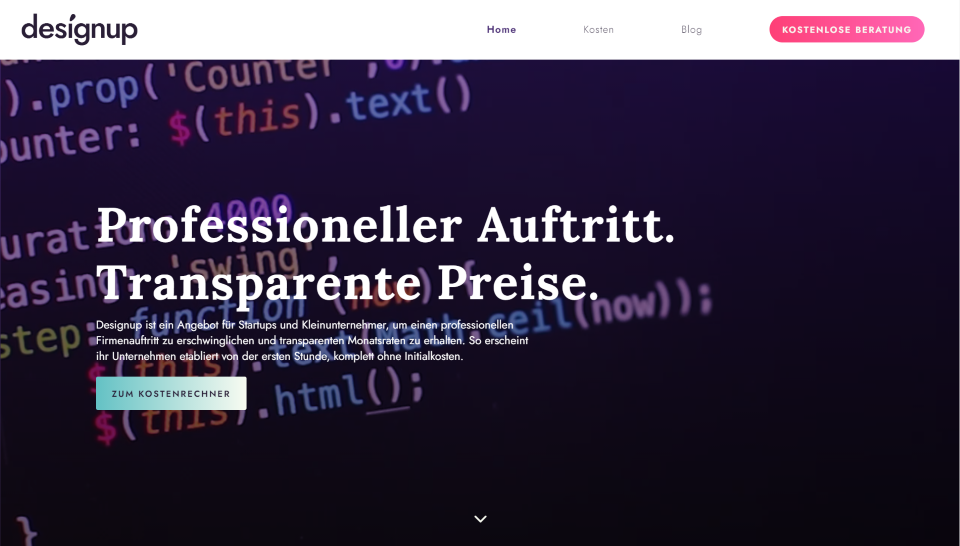 Diese Seite wurde von Tobija von Designup eingereicht. Dieser nutzt Lila und verwandte Farben hervorragend für das Branding. Im Heldenbereich wird ein Video hinter einem violetten Overlay mit einer Beschreibung und einem CTA im Vordergrund angezeigt. Der Header enthält Links mit viel Platz dazwischen und einen CTA in fettem rotem Farbverlauf. Mehrere Abschnitte enthalten einen lila Hintergrund, Hintergrundmuster oder beides. Der Abschnitt für Erfolgsgeschichten zeigt Bilder der Arbeit auf Computerbildschirmen mit violetten Schaltflächen, um die Arbeit zu sehen. Ein anderer Abschnitt verwendet Klappentexte mit violetten Symbolen. Ein Abschnitt passt zwischen diese beiden mit einem grünen Hintergrund mit Farbverlauf, der auffällt. Die Hintergrundmuster aus dem vorherigen und nächsten Abschnitt überlappen diesen. Die Kostenseite verfügt über einen einzigartigen Rechner mit einem roten Abschnitt, der am unteren Rand der Seite haftet, bis Sie beim Scrollen diesen Abschnitt erreichen. Die Markenfarben funktionieren gut, um dieses Design miteinander zu verbinden.