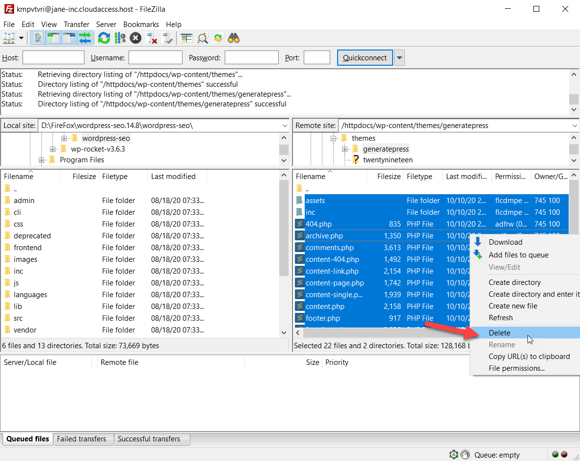 Sobald Sie die Dateien der älteren Version Ihres Designs haben, stellen Sie eine Verbindung zum FileZilla FTP-Client her und gehen Sie zum Ordner Ihres aktiven Designs . In unserem Fall ist es GeneratePress v3.0.1 und wir werden es auf v2.4.1 herabstufen. Löschen Sie dann alle Dateien und Ordner aus dem Ordner des Designs.