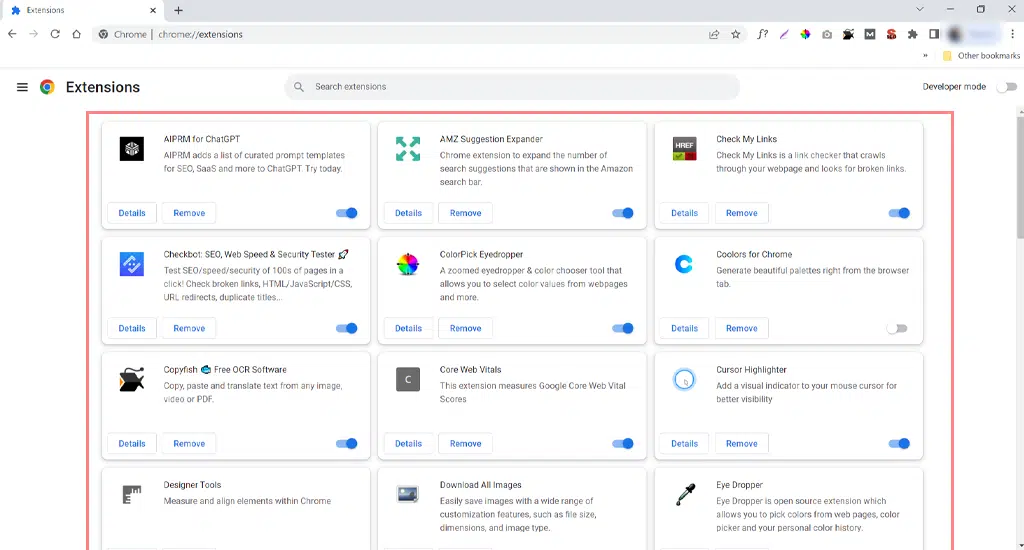 Um eine Erweiterung zu deaktivieren, klicken Sie einfach auf die Umschaltfläche unten rechts in der Beschreibung jeder Erweiterung. Deaktivieren Sie die Erweiterungen weiterhin, bis der Fehler err_file_not_found nicht mehr angezeigt wird.