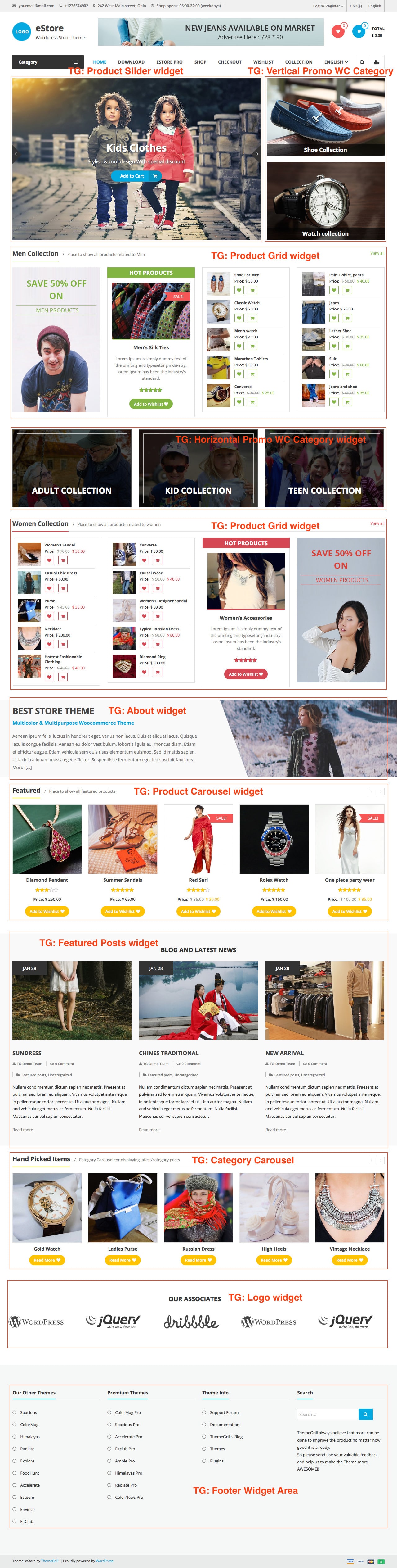 Nun ist es für jede E-Commerce-Site wichtig, dass sie viele Links in der Kopfzeile enthält, die den Besuchern helfen, zu den gewünschten Seiten zu navigieren. Der eStore hat 3 Menüpositionen ganz oben, die Ihnen helfen, eine beliebige Anzahl von Links direkt in der Kopfzeile auf eine schön organisierte Weise anzuzeigen. Die primäre Kopfzeilen-Menüleiste hat auch zwei weitere Symbole. Die Symbole "Suchen" und "Mein Konto" helfen den Besuchern, Ihren Shop zu durchsuchen bzw. zu ihrer Kontoseite zu gelangen. Außerdem unterstützt der Header-Support-Header-Widget-Bereich, der Ihnen hilft, jedes Widget Ihrer Wahl anzuzeigen. Die aktuelle Demo zeigt Imagewerbung.