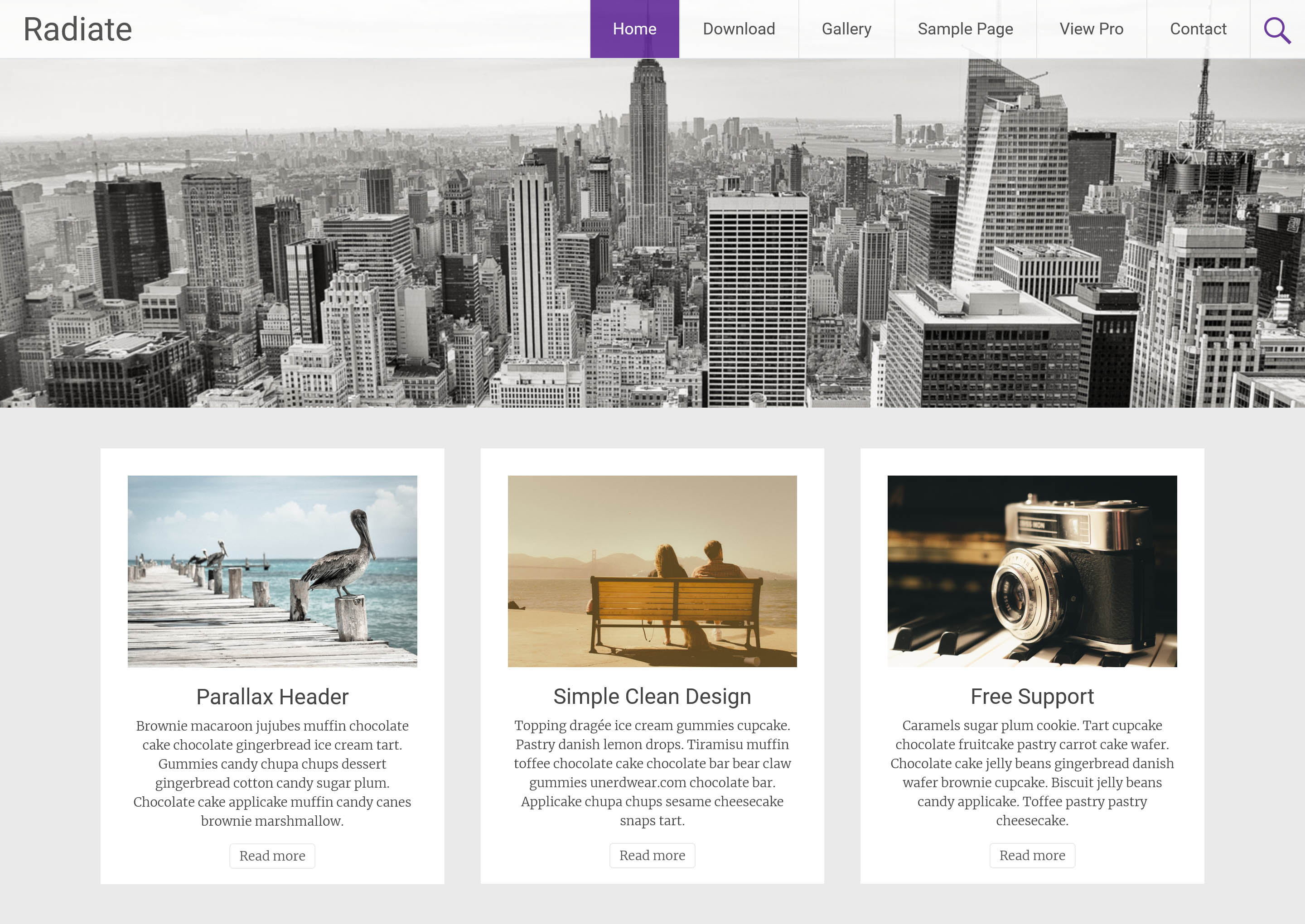 Wenn Sie etwas Leichtes und Funktionelles brauchen, ist Radiate eine ausgezeichnete Option. Es hat ein sauberes und einfaches Aussehen, mit einem Parallax-Header-Bild, das die Aufmerksamkeit Ihrer Besucher auf sich ziehen wird