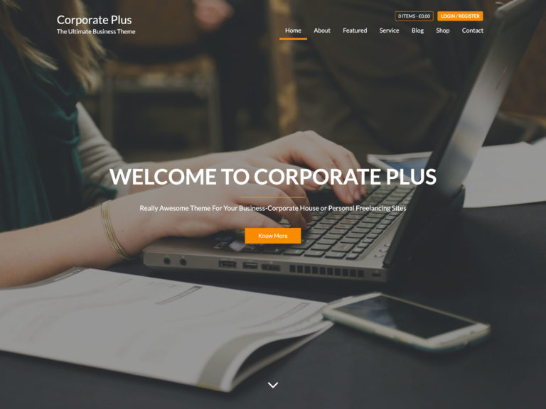 Ein weiteres erwägenswertes Thema ist Corporate Plus, ein Mehrzweckthema, das ein unkompliziertes, professionelles Aussehen bietet. Das Design selbst ist einfach, aber dennoch ansprechend und bietet die übliche Palette von Funktionen, nach denen Unternehmen suchen, von überzeugenden Handlungsaufforderungen bis hin zu ansprechenden Serviceabschnitten.