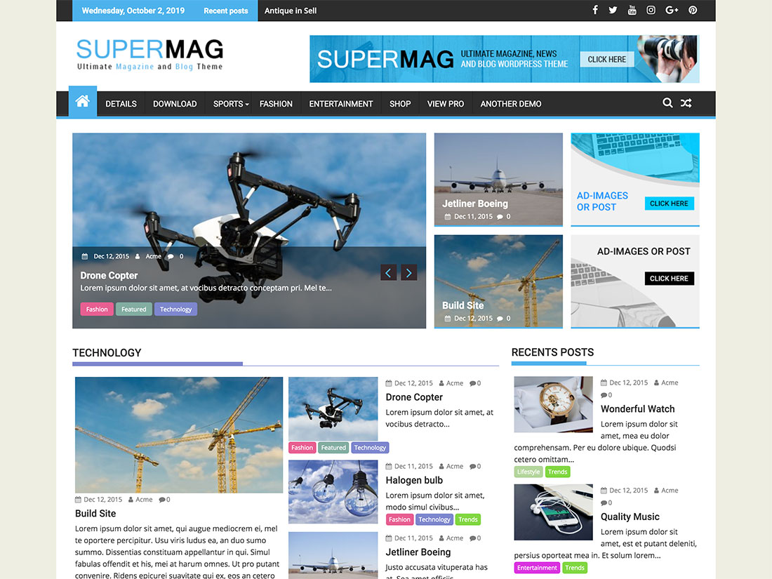 Der Großteil Ihrer Inhalte wird mit dem Customizer oder den Widgets verwaltet. Sie können die Kopfzeile, die Fußzeile, die Seitenleiste und die Startseite ändern. Social-Media-Integration ist ein großer Teil des SuperMag-Themas und macht es den Leuten leicht, Ihre Inhalte zu teilen.