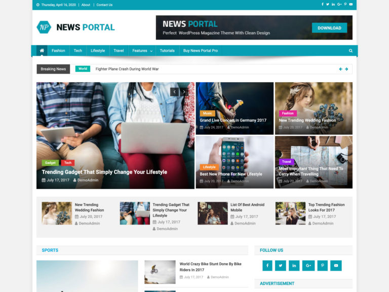 Abgesehen von den Grundlagen der Funktionen ist News Portal ein stilvolles Thema, das von Natur aus professionell ist. Sie können es jedoch problemlos für eine gelegentliche Veröffentlichung sowie für eine geschäftliche verwenden. Ihre Inhalte und die von Ihnen ausgewählten Bilder werden letztendlich das Aussehen dieses Themas verändern. Und sollte es nicht immer so laufen? Ihre Inhalte stehen hier im Mittelpunkt.