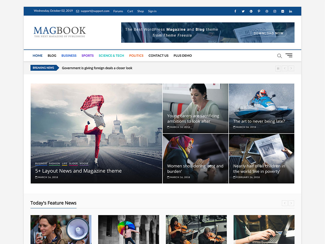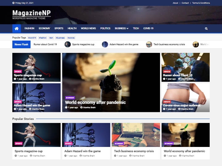 Dieses Widget-basierte Thema ist eine solide Option für eine Vielzahl von Projekten im Magazinstil, darunter Sportseiten, Nachrichtenportale und Blogs. Da MagazineNP mit WooCommerce kompatibel ist, werden Sie keine Probleme haben, einen Online-Shop in Ihre Website zu integrieren.