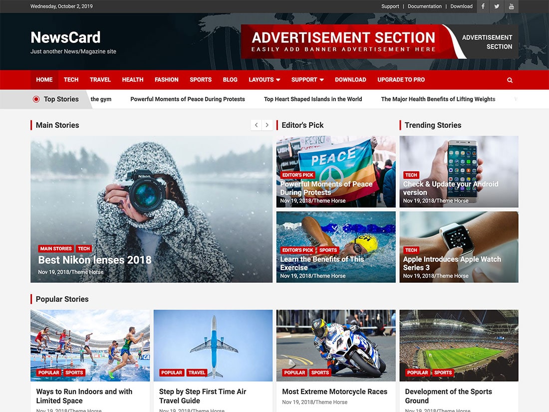 Das NewsCard-Design ist ein helles und modernes Design im Magazinstil, das sich perfekt für alle eignet, die ihr Magazin mit Anzeigen monetarisieren möchten. Für den Anfang gibt es eine große Werbefläche direkt unter der Navigation, ganz zu schweigen davon, dass Sie Anzeigen einfach in die Seitenleiste oder in den Beitrag einfügen können. Das Thema enthält auch einen Nachrichtenticker, der perfekt ist, wenn Sie häufig aktuelle Nachrichten veröffentlichen.