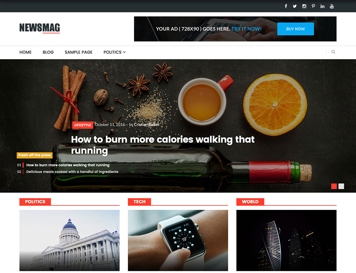 Wir mögen die Schaltflächen für soziale Medien, da Sie dafür kein weiteres Plugin eines Drittanbieters installieren müssen. Ganz zu schweigen davon, dass die vorgestellten Bilder auf der gesamten Homepage unerlässlich sind, um die Leute davon zu überzeugen, auf Ihre Artikel zu klicken. Wenn Sie daran interessiert sind, ein WordPress-Theme ohne viel Codierung zu verwenden, ist dies eine weitere kostenlose Option, die dies ermöglicht. Zum Beispiel müssen Sie Ihren Quellcode nicht anfassen, da die meisten Elemente mit Hilfe von Widgets, Seitenleisten und Fußzeilen implementiert werden.