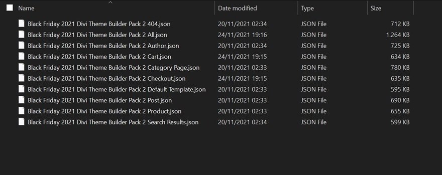 Nachdem die Datei heruntergeladen wurde, entpacken Sie den Ordner „Divi-Theme-Builder-Packs.zip“ und öffnen Sie ihn. Suchen Sie den Ordner mit dem Namen „Black Friday 2021 Theme Builder Pack 2“ und öffnen Sie ihn. Dort sehen Sie insgesamt 10 JSON-Dateien enthalten. Neun der Dateien können verwendet werden, um jede der Vorlagen einzeln zu importieren. Eine der Dateien namens „Black Friday 2021 Divi Theme Builder 2 All.json“ kann verwendet werden, um das gesamte Theme Builder-Paket (alle Vorlagen) auf einmal auf Ihre Website zu importieren.