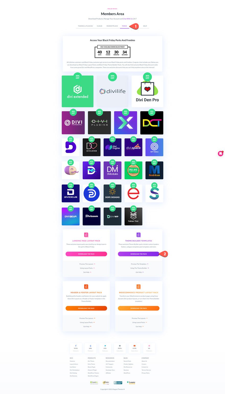 Sobald Sie eingeloggt sind, klicken Sie auf den Link ganz rechts im Menü des Mitgliederbereichs namens „Perks“. Scrollen Sie dann nach unten und klicken Sie auf die Schaltfläche „Download the Pack“, um die Theme Builder-Vorlagen herunterzuladen.