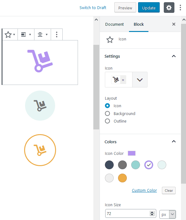 Das Getwid-Plug-in verwendet Font Awesome-Symbole, die automatisch das Design (Stilgröße) von jedem Gutenberg-fähigen Design übernehmen, das Sie möglicherweise verwenden, und Sie können zusätzlich die bevorzugte Farbe aus einer Farbpalette einer Designmarke auswählen. Dadurch fügen sich Symbole viel einfacher in Ihr gesamtes Themendesign ein.