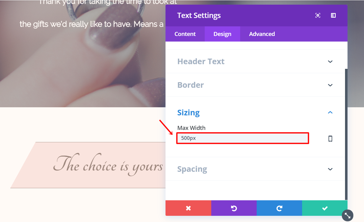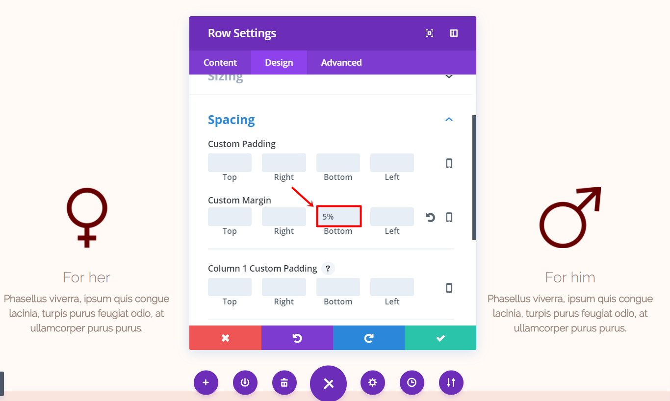 Ändern Sie die benutzerdefinierte Breite auf „55%“ in der Unterkategorie „Größen“ der Registerkarte „Design“ und ändern Sie den unteren Rand in „5 %“ in der Unterkategorie „Abstand“.