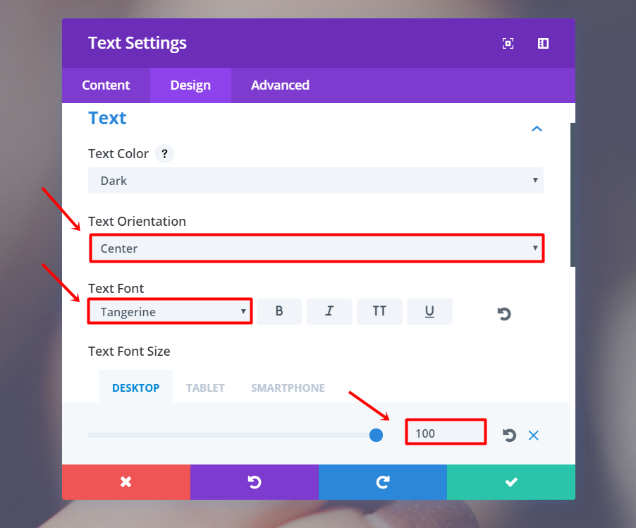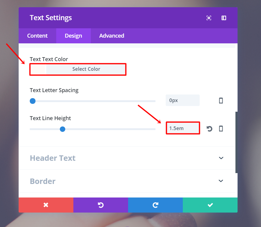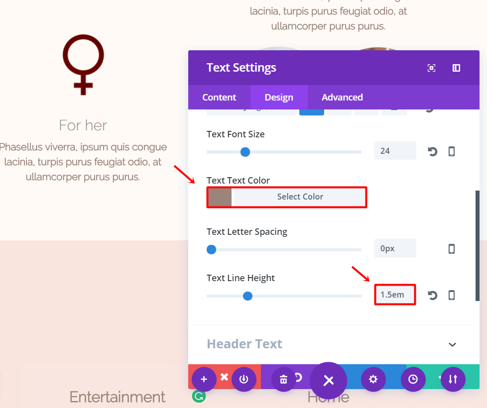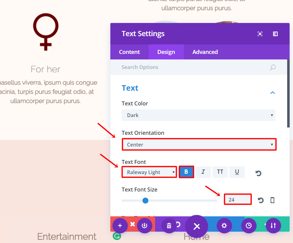 Fahren Sie fort und fügen Sie der Zeile ein neues Textmodul hinzu. Fügen Sie Ihren Text in der Unterkategorie Text der Registerkarte Inhalt hinzu. Wechseln Sie danach zur Registerkarte Design und nehmen Sie die folgenden Änderungen an der Unterkategorie Text vor: