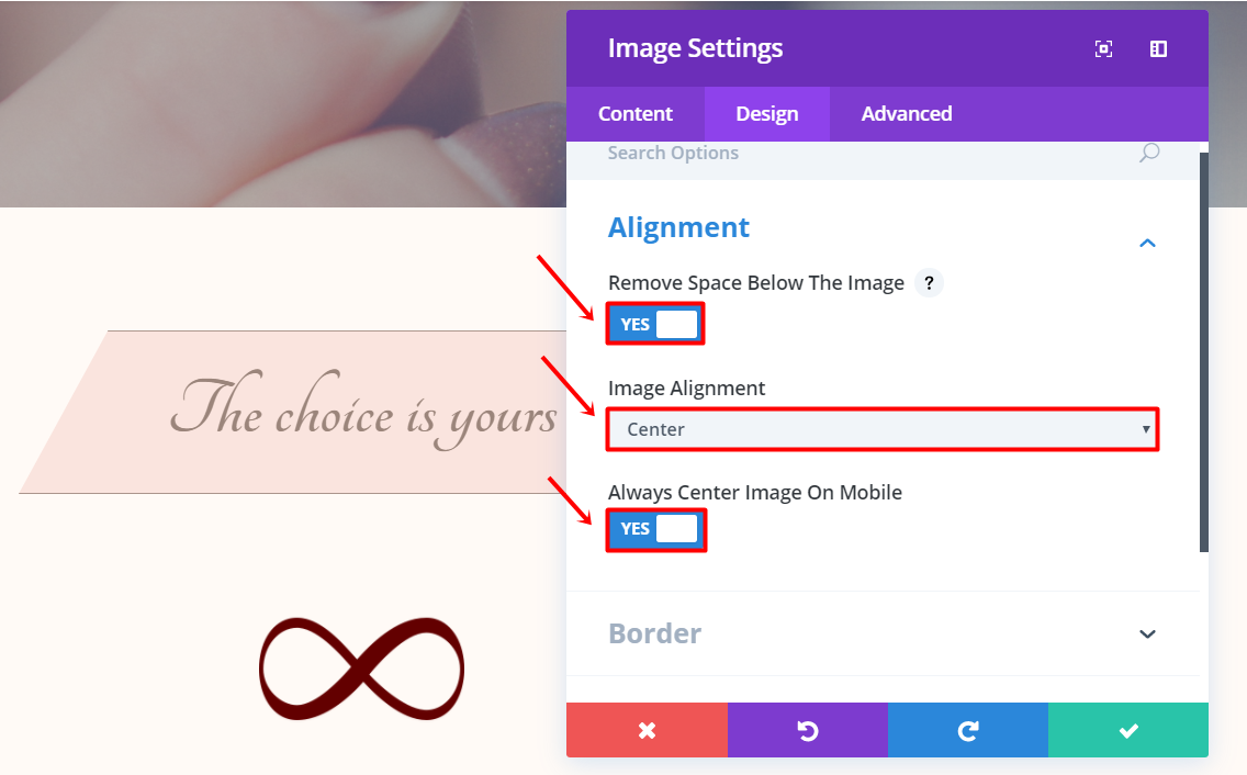 Fügen Sie der Zeile ein Bildmodul hinzu und laden Sie das Bild in die Unterkategorie Bild der Registerkarte Inhalt hoch. Gehen Sie dann zur Registerkarte Design, entfernen Sie den Platz unter dem Bild, wählen Sie "Center" für die Bildausrichtung und zentrieren Sie das Bild immer auf dem Handy.