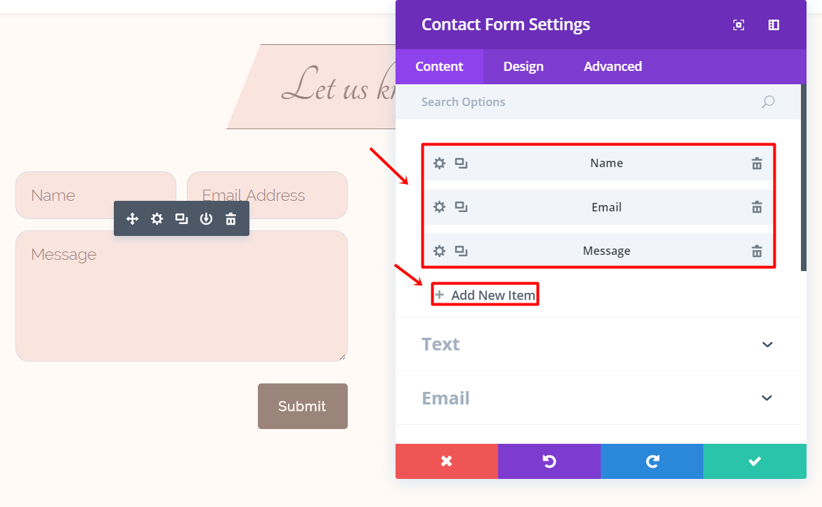 Auf der Registerkarte Inhalt des Kontaktformulars können Sie jetzt drei Felder hinzufügen; Name, E-Mail und Nachricht.