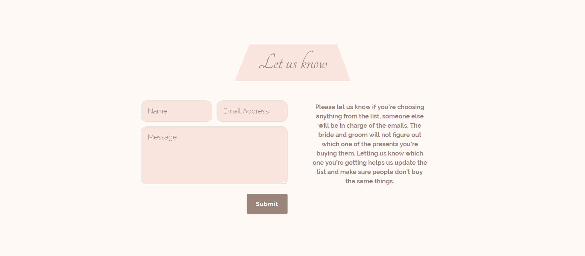 Der Zweck des Kontaktformulars im Layout besteht darin, dass die Leute weitergeben können, welches Geschenk sie für das Paar kaufen. Sobald ein Geschenk angenommen wird, kann es auf der Website durch ein anderes ersetzt werden. Dadurch wird es weniger wahrscheinlich, dass zwei Gäste das gleiche Geschenk mitbringen.