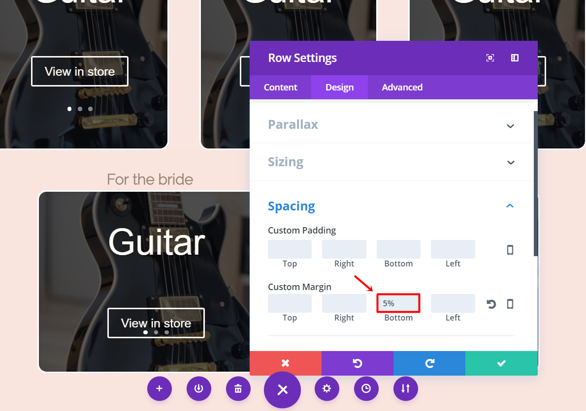 Wechseln Sie als Nächstes zur Registerkarte Design der Zeile und fügen Sie '5%' zum unteren Rand in der Unterkategorie Abstand hinzu.